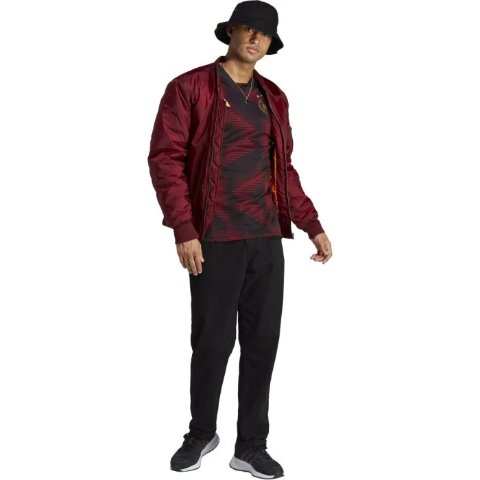 Das adidas DFB Away Trikot der WM 2022 ist ein echtes Fanartikel-Highlight. Mit dem rot/schwarzen Grafik Design hebt sich das Auswärtstrikot der WM 2022 von allen anderen Deutschland Trikots deutlich ab. Neben dem Grafik Muster sind die typischen 3 Streifen von adidas beim Away Jersey 2022 in einem edlen goldenen Farbton gehalten. Hier bekommst das Deutschland Trikot Away mit normalen Schnitt in den Größen S bis 3XL.