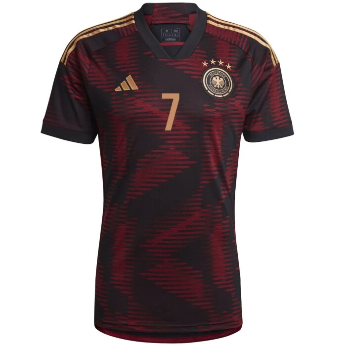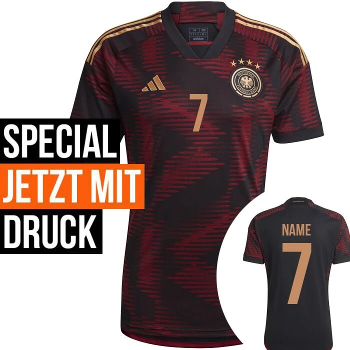 Durch das adidas DFB Away Trikot WM 2022 mit Namen und Nummern kannst du dir dein ganz eigenes Trikot der Nationalmannschaft erschaffen. Du entscheidest was du auf deinem schwarz/roten DFB Jersey stehen haben willst und wir bedrucken es exklusiv für dich. Auch ohne Bedruckung ist DFB Auswärtstrikot der WM 2022 eines der schönsten Trikots. Mit Namen und Nummern wird das DFB WM 2022 Away Jersey jedoch zu einem echten Highlight.