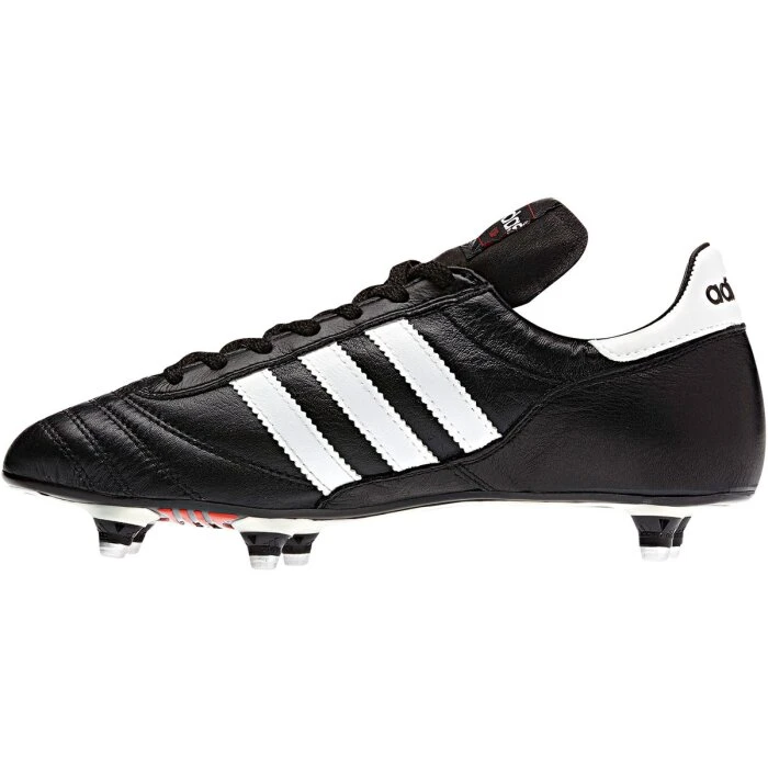 Die adidas World Cup sind Stollenschuhe mit einer klassischen Schraubstollensohle. Als Fußballschuhe für den weichen Rasenplatz haben die adidas World Cup eine Sohle die sich deutlich von allen anderen Sohlen Unterscheidet. Hauptmerkmal der Schraubstollensohle ist das Alustollensystem mit Gewinde. Anders als bei Nockenschuhe lassen sich dabei World Cup von adidas so die einzelnen Stollen wechseln. Alle 6 Stollen können bei den klassischen adidas Stollenschuhen durch das Gewindesystem gewechselt werden. Für etwas Besonderes beim adidas World Cup sorgt jedoch nicht nur die Sohle sondern auch das Material. Mit einem weichen K-Leder Material hat der World Cup das gleich Leder Material wie auch die adidas Copa Mundial Fußballschuhe. Mit dem adidas Copa Mundial verbindet der adidas World Cup zudem auch die Schnittform. Beide Fußballschuhe von adidas sind gleich geschnitten und unterscheiden sich nur bei der Schraubstollensohle. Die adidas World Cup Stollensohle haben durch das Material aus K-Leder einen besonders guten Tragekomfort. Das weiche K-Leder mit natürlichem Ursprung passt sich dabei noch besser dem Fuß an und vermittelt so auch ein besseres Ballgefühl. Durch die Stollensohle sind die adidas World Cup Fußballschuhe jedoch nur für den wirklich weichen Rasenplatz gedacht. Alle anderen Spieler die den Komfort des K-Leder Material erleben wollen sollten zum schwarzen adidas Copa Mundial greifen.