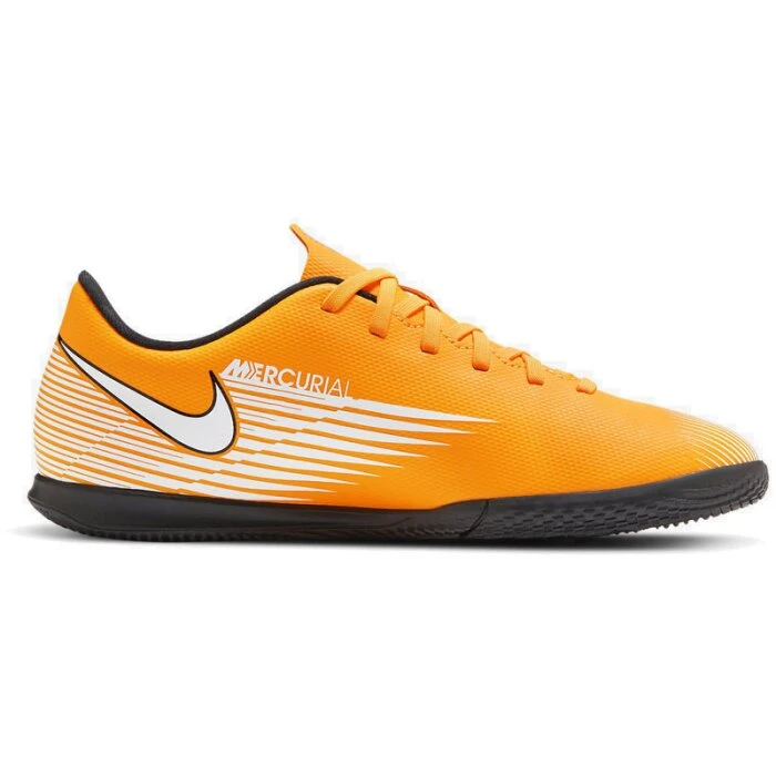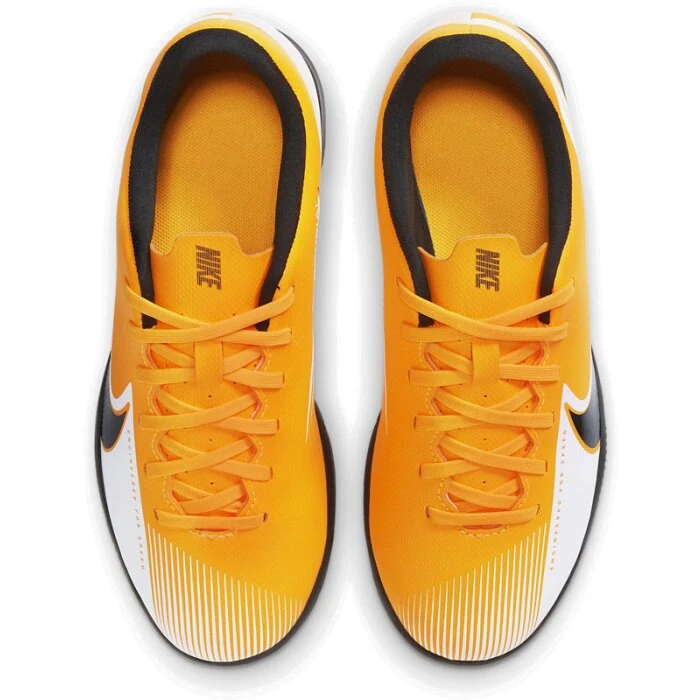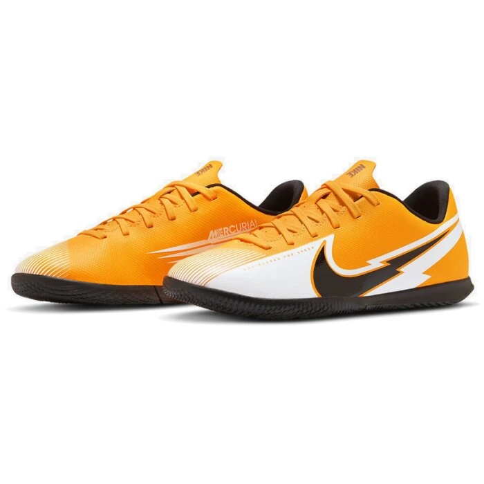 Durch die orangene Nike JR Mercurial Vapor 13 Club IC Daybreak Pack bekommst du die Kinderhallenschuhe in der Farbe die auch die Star-Spieler tragen. Mit der orangene Farbe ist der Mercurial gerade bei Kids extrem gefragt. Als Hauptmerkmale kommt der Nike Mercurial Vapor XIII Club für Kinder aus einem Synthetik Material und mit einer abriebfesten Sohle.