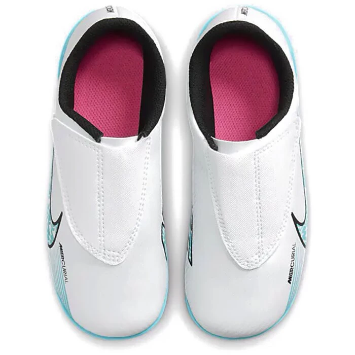 Diese weißen Nike Jr. Zoom Mercurial Vapor 15 Club FG/MG bestellst du als Fußballschuhe für Kinder aus dem Blast Pack in der Farbe Weiß/Pink Blast/Indigo Haze/Baltic Blue.